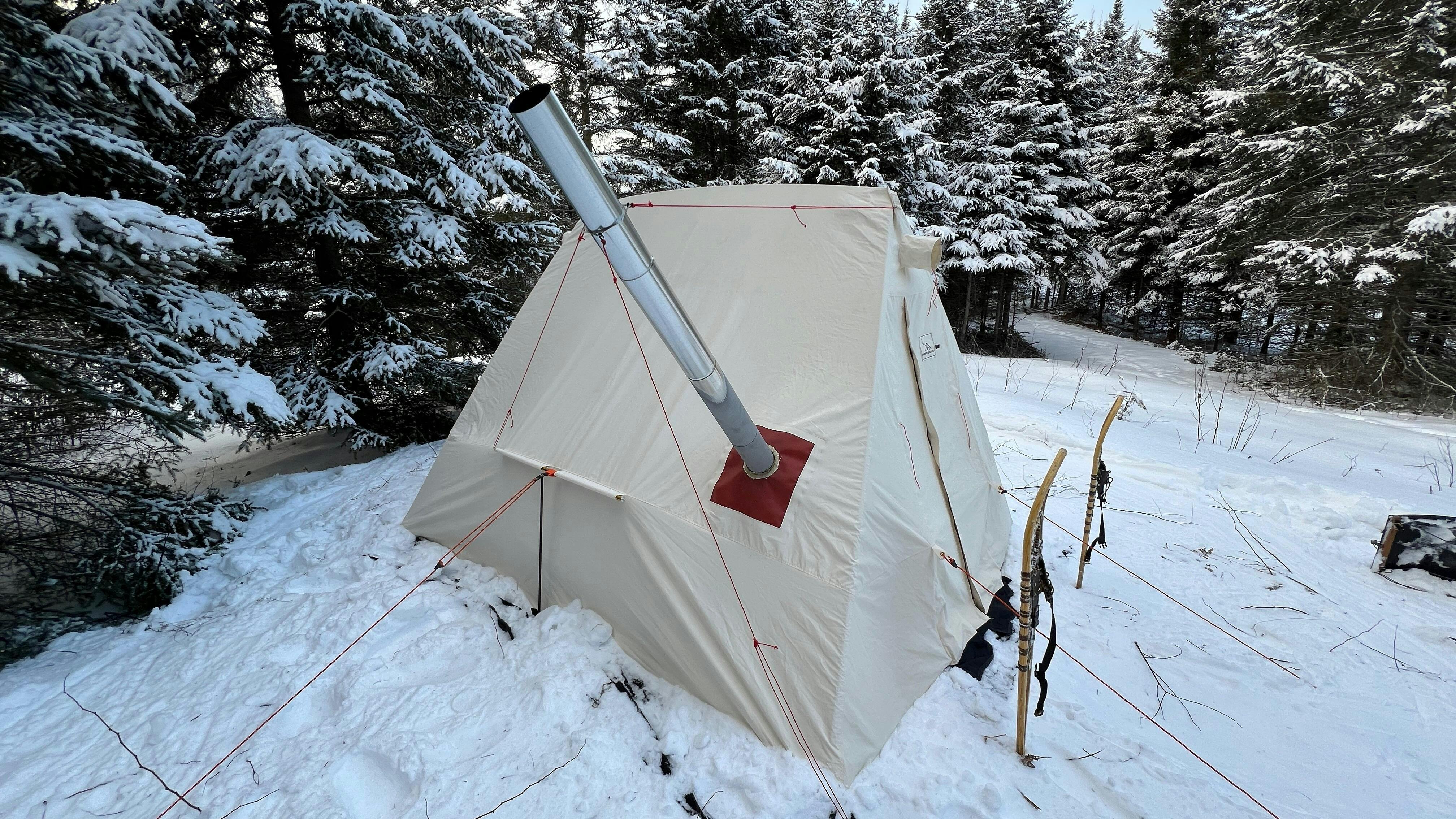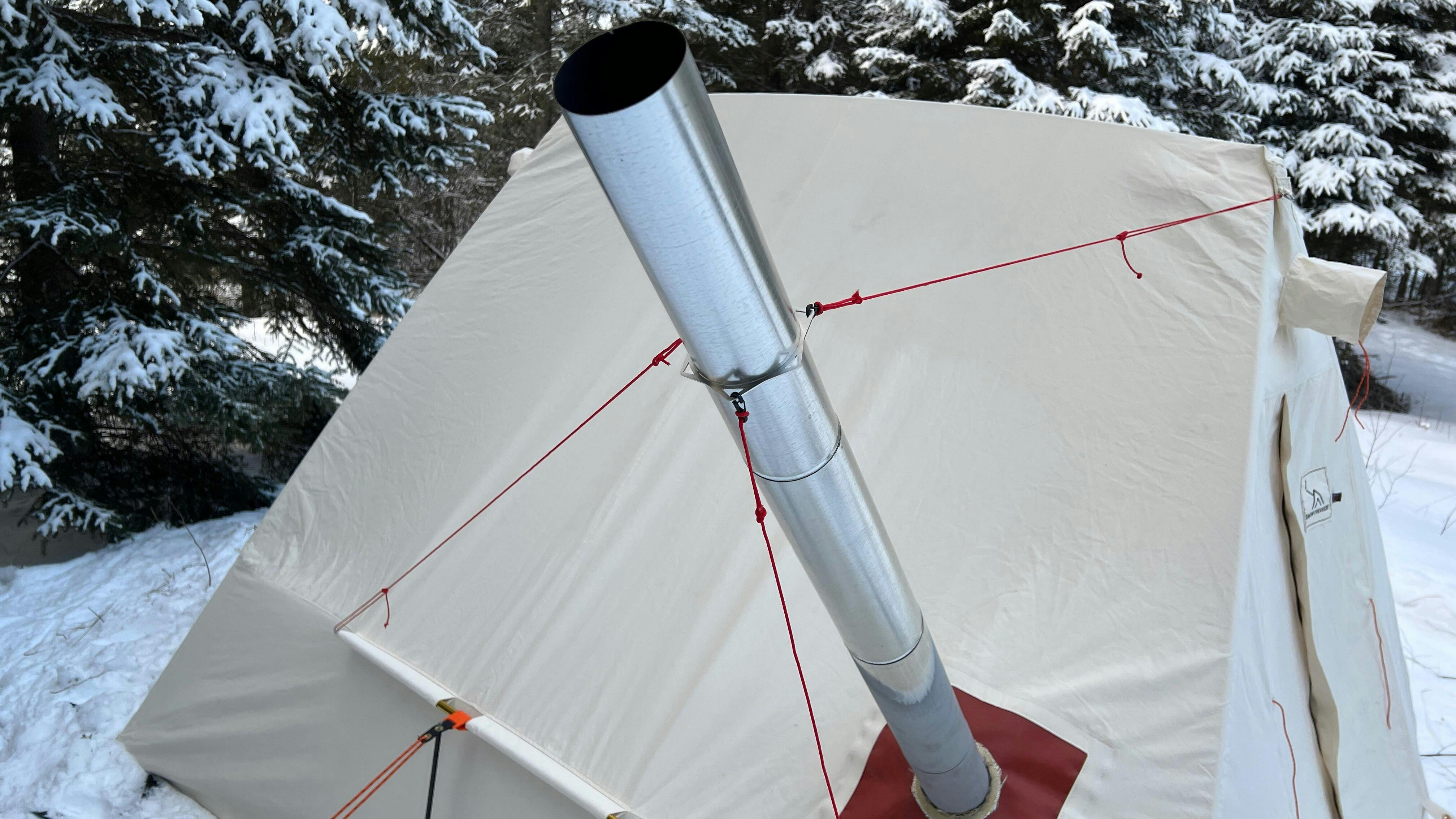 A quick and easy system to brace and center angled stove pipes, fully supported by the tent structure.